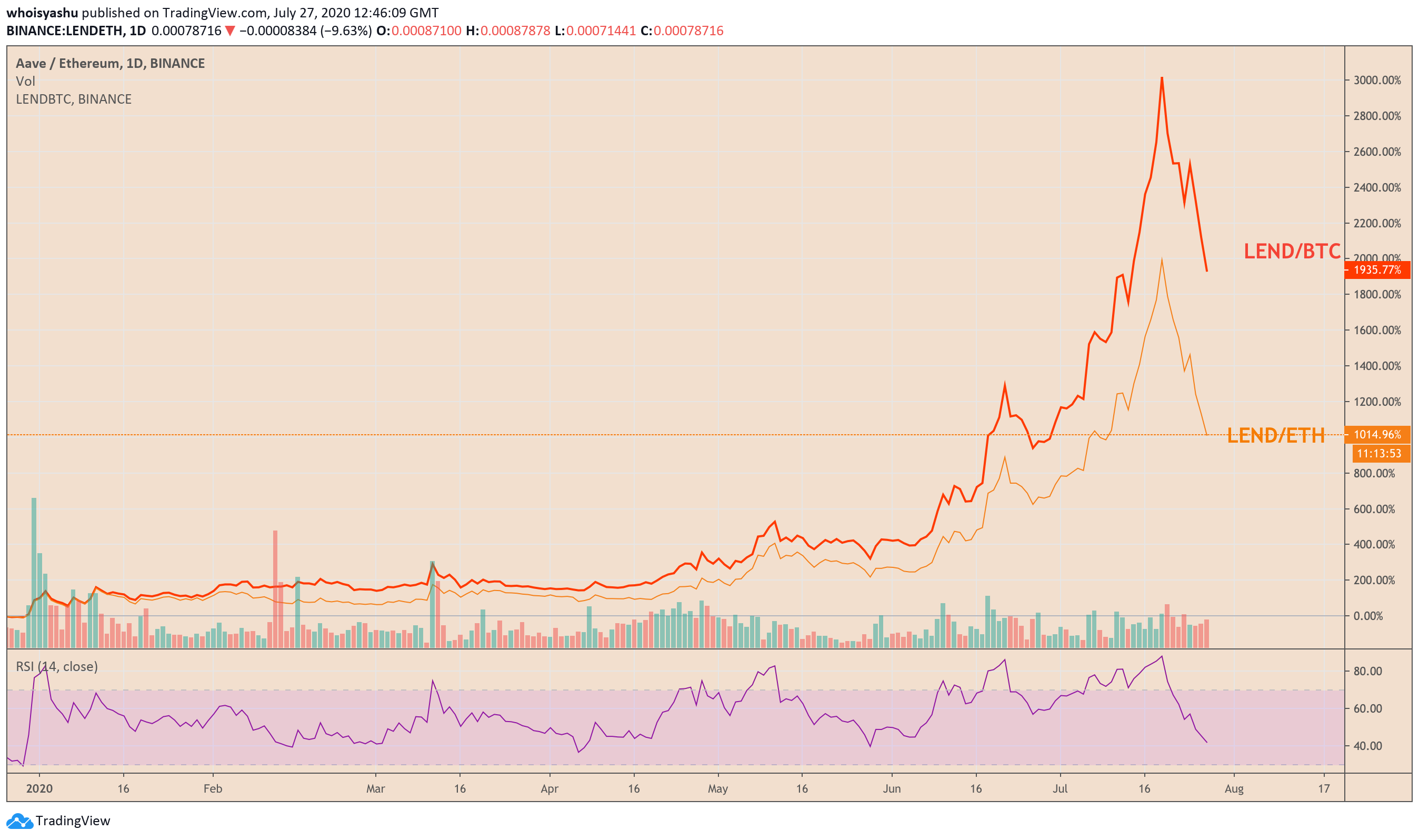 As Bitcoin grows amid higher global demand for safe-haven assets (read Gold), the selling pressure on LEND may mount further. That is very visible during its first parabolic rally in 2018. Back then, the LEND/USD rate surged by more than 1,500 percent, only to wipe those gains entirely by the end of 2018.