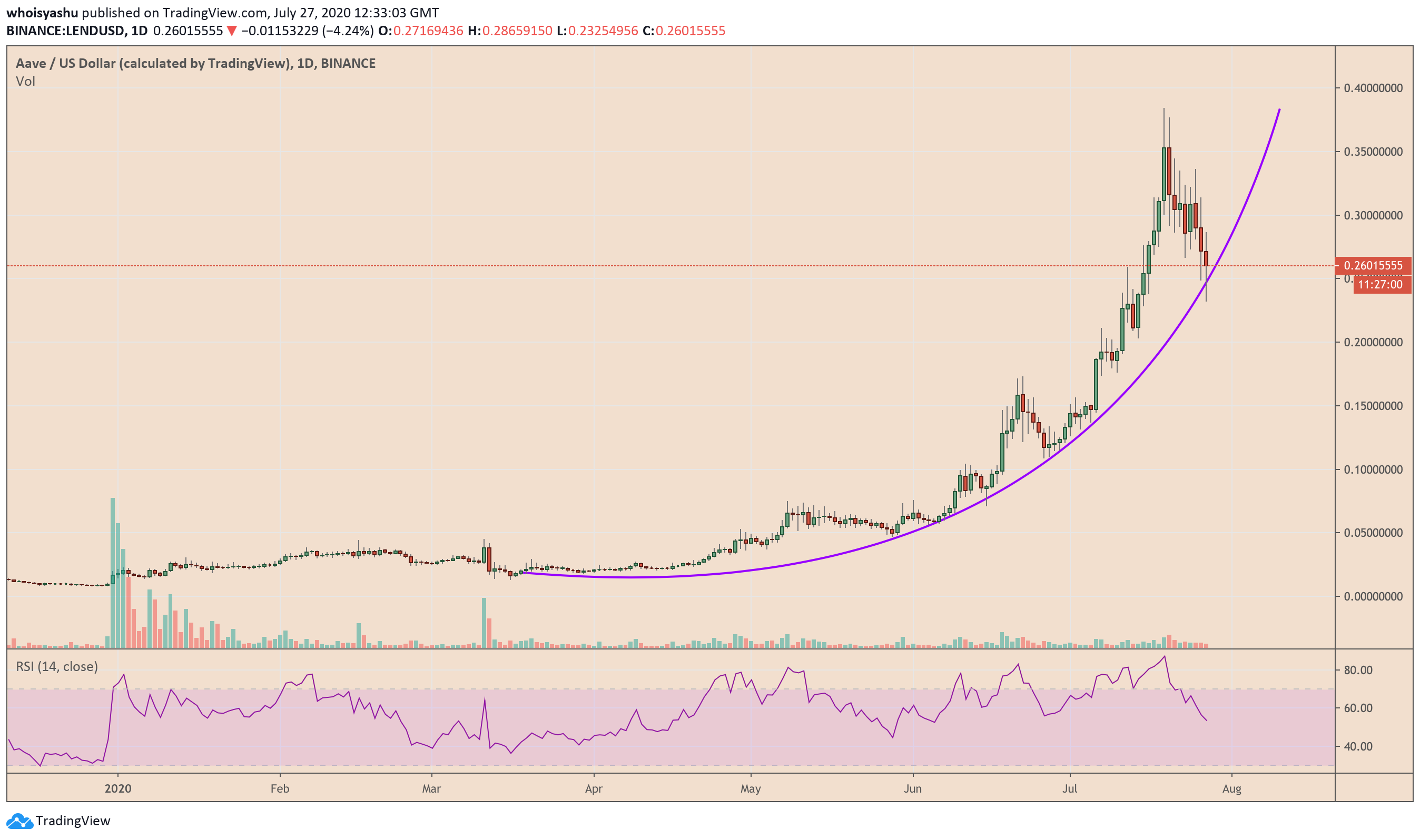 After topping at near $0.384 earlier in July, the LEND/USD exchange rate corrected lower by circa 40 percent. As of Monday, the pair had established an intraday low at $0.232, a move that crashed it below its parabolic support for the first time this year.