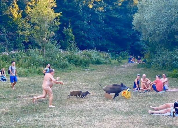 “Another naked sunbather chased and threw stones at the boar until it dropped the bag.”