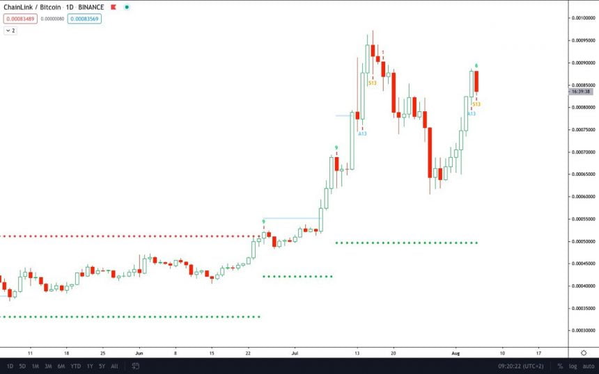 As the chart depicts above, Chainlink had a sharp fall each time the 13 count appeared in the past. On the Bitcoin trading pair, Chainlink set a lower high. The previous high was marked by the same 13 count and setup.