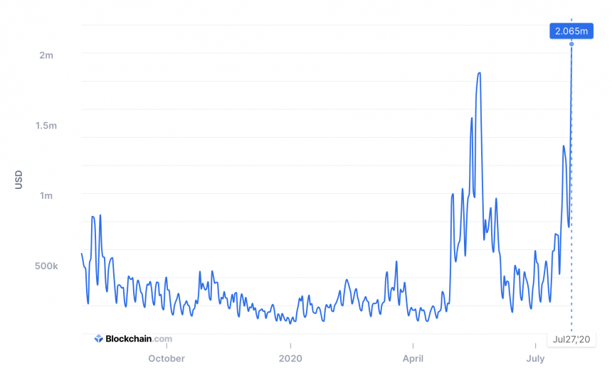According to data from blockchain.com, nearly $3 billion worth of transactions ran through the BTC network on July 27th.