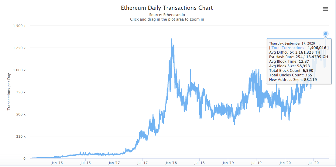 On Sept. 17, the amount of daily transactions on the Ethereum network amounted to 1,406,000, according to data from major Ethereum browser Etherscan. This is the highest number of daily transactions ever recorded on the Ethereum network.