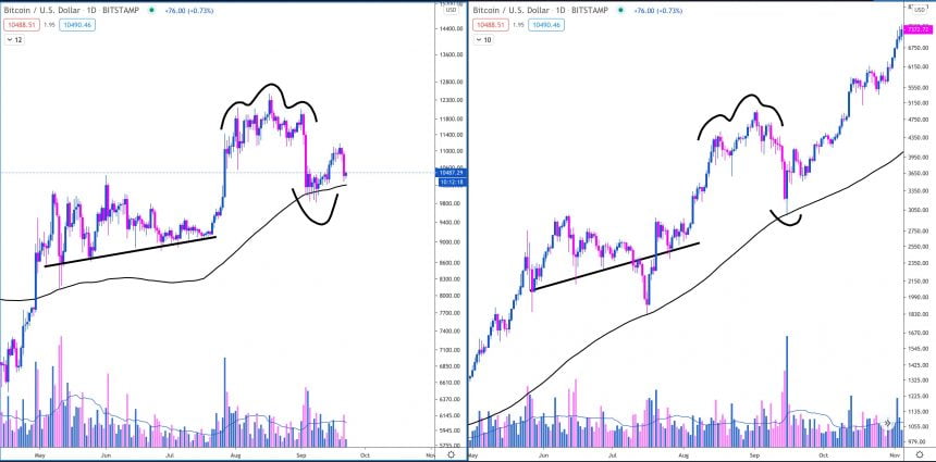 In the above comparison, the most recent top in Bitcoin price action closely resembles the structure that took Bitcoin out from its bear market bottom the last time around and sent the cryptocurrency toward $20,000.